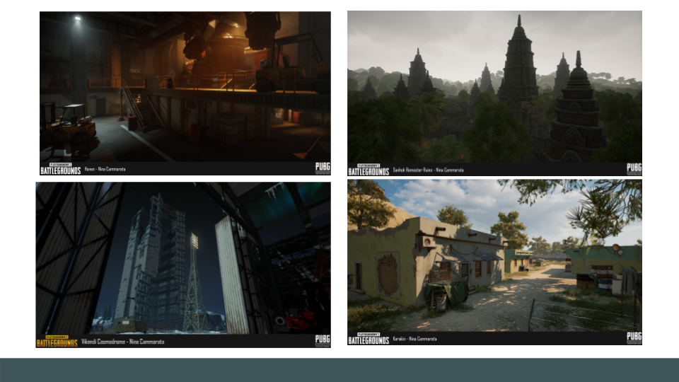 Hi everyone, My name is Nina Cammarata, I’m an Environment Artist at PUBG Madison working on PUBG. I’ve worked in games for almost 7 years now. Previously, I worked at NetherRealm on Injustice 2 Mobile and MKX Mobile. Here is a sample of things that I’ve worked on over my career.