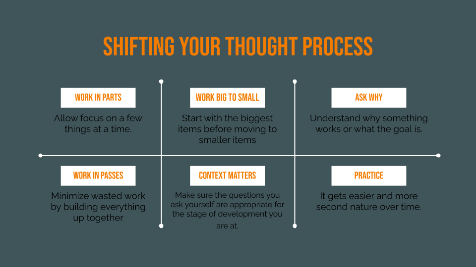 The first thing to consider is what your budget might look like. Budgets can change over the course of production, and there will always be optimization at the end, but it's good to have some foresight regarding what will be doable and what won’t (if you can) otherwise you might be left redoing a lot of things. When you have the scheduled time to redo stuff at the end that might not be as big of a deal but if you’re working on a time crunch, minimizing large scale rework is important.